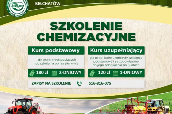 Powiatowy Zespół Doradztwa Rolniczego w Bełchatowie informuje o organizacji szkolenia chemizacyjnego dla użytkowników środków ochrony roślin. Udział w szkoleniu umożliwia uzyskanie lub odnowienie wymaganych prawem uprawnień ...