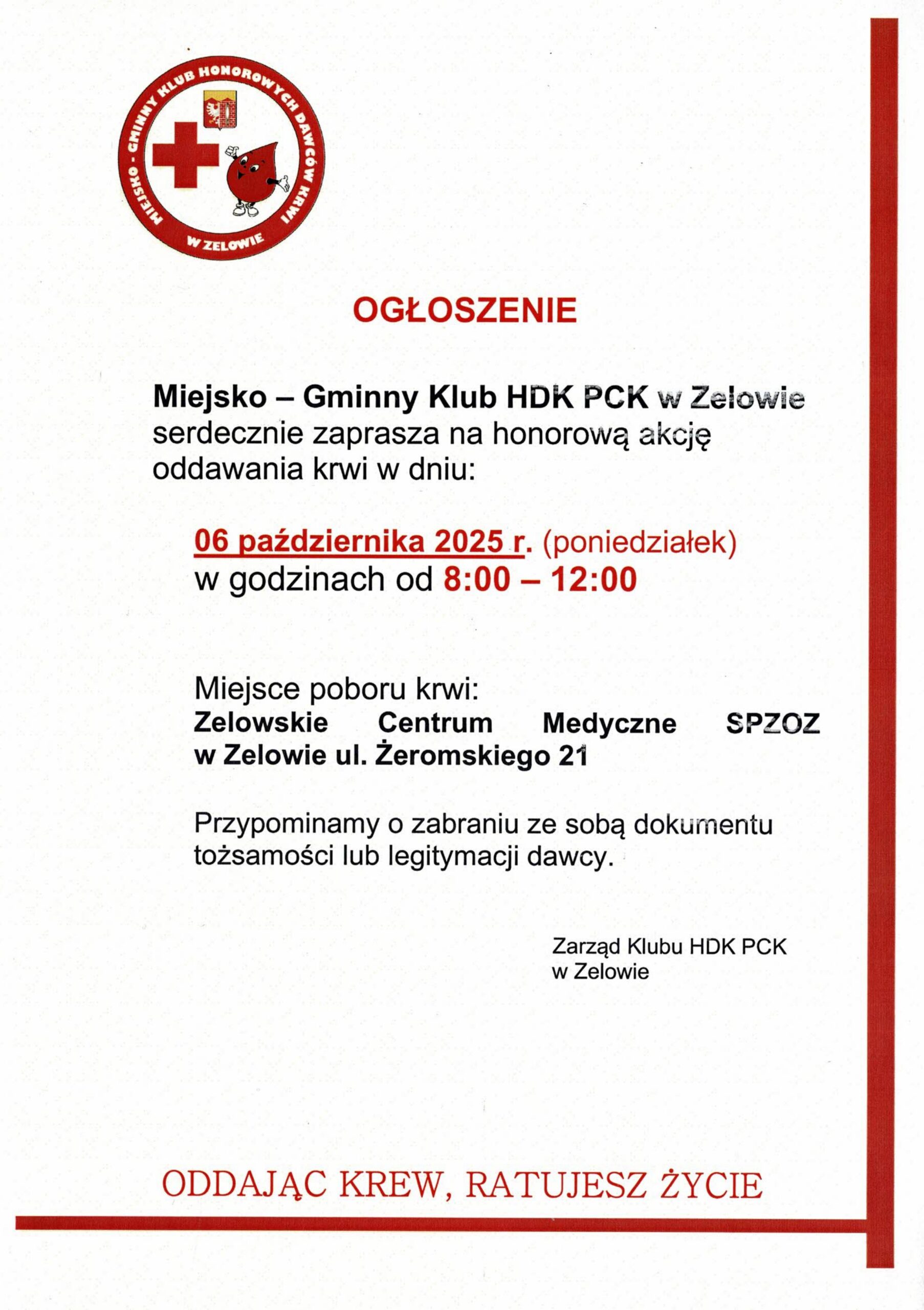 Miejsko-Gminny Klub Honorowych Dawców Krwi w Zelowie zaprasza wszystkich chętnych do udziału w akcji krwiodawstwa, która odbędzie się 6 października (poniedziałek).