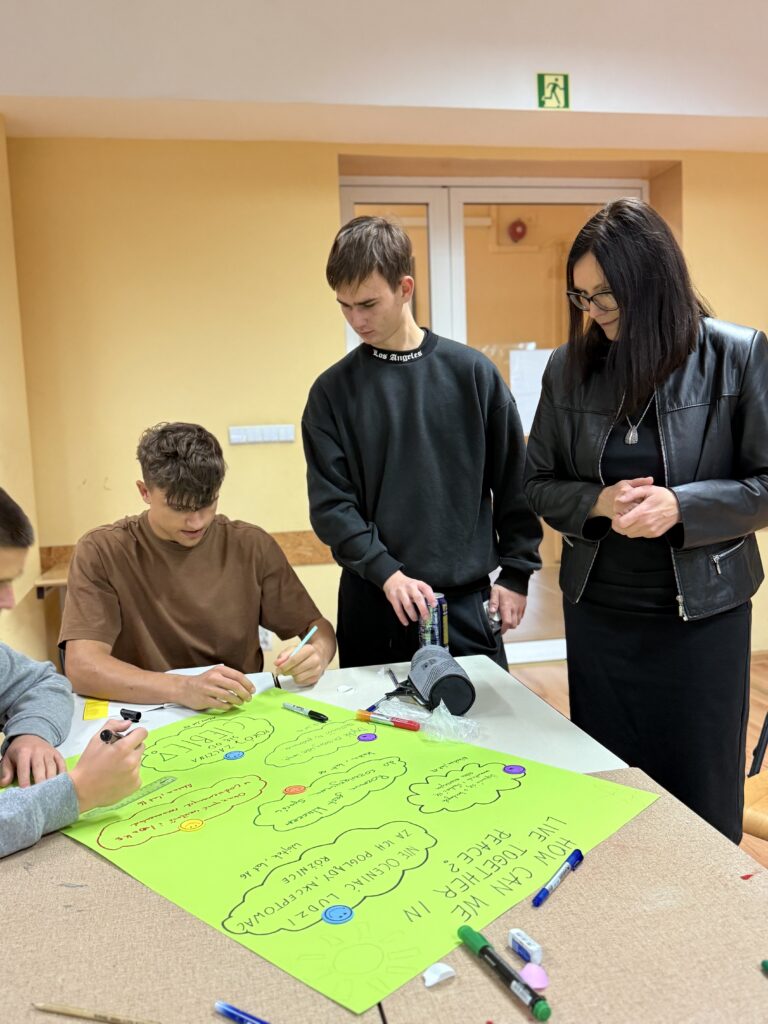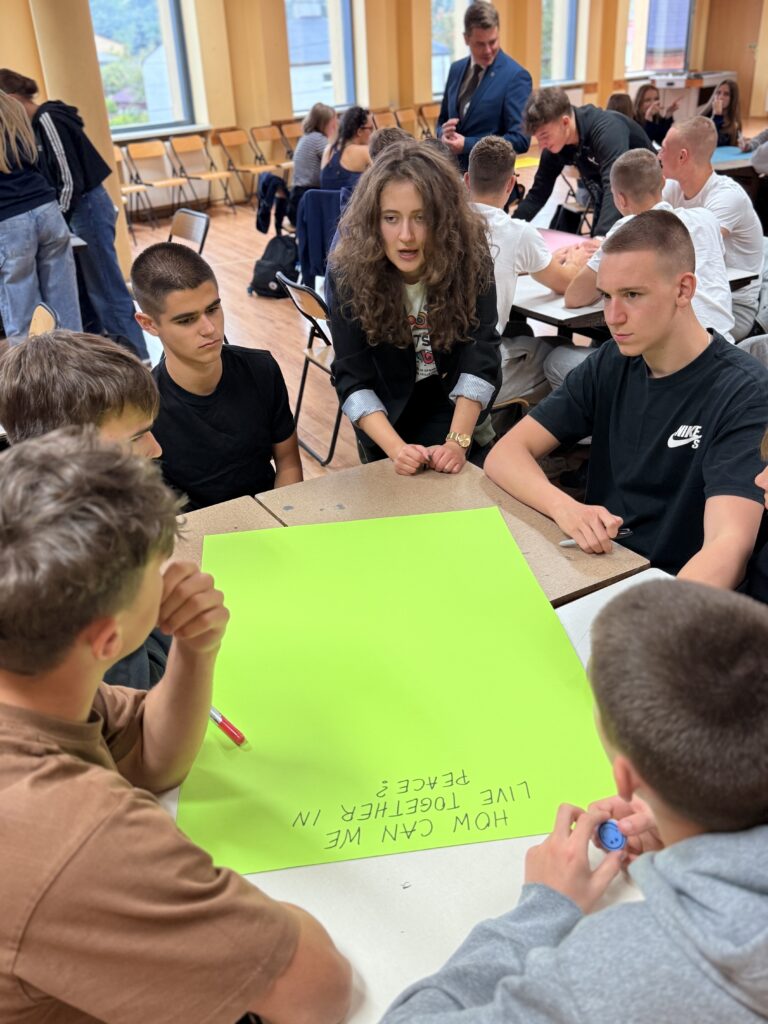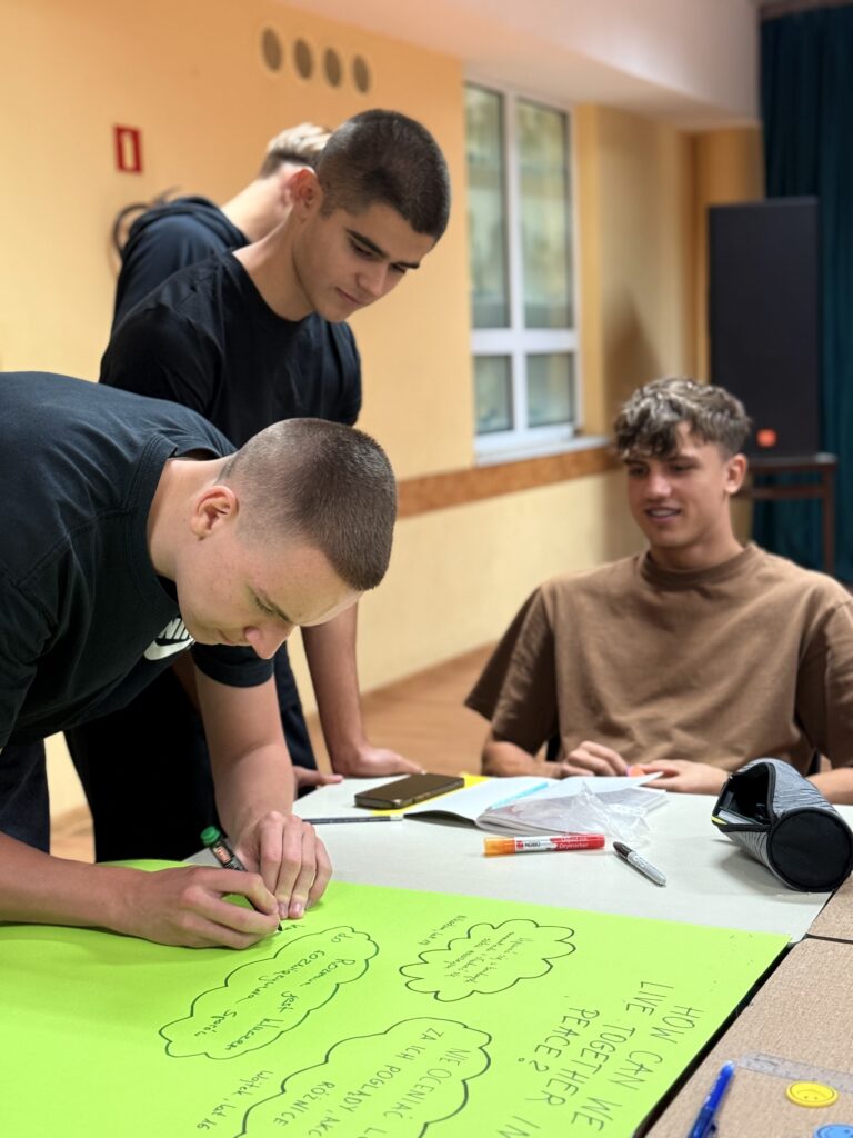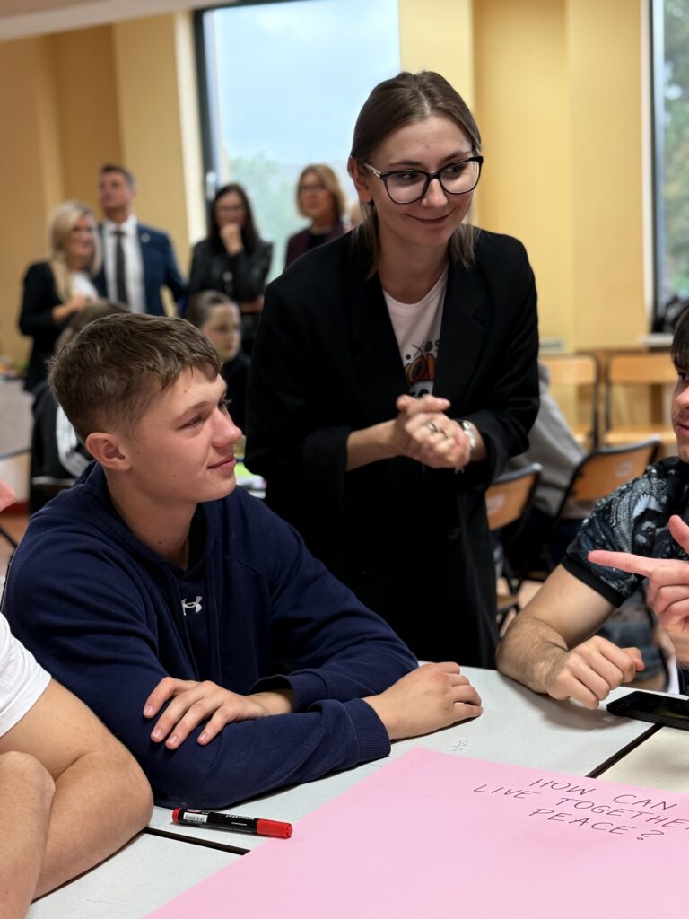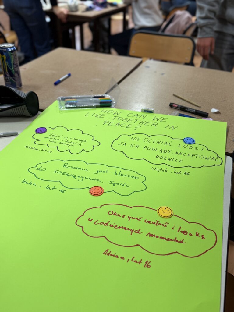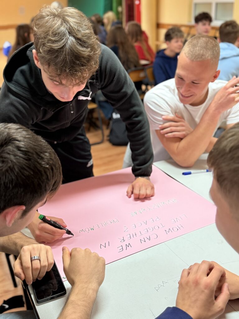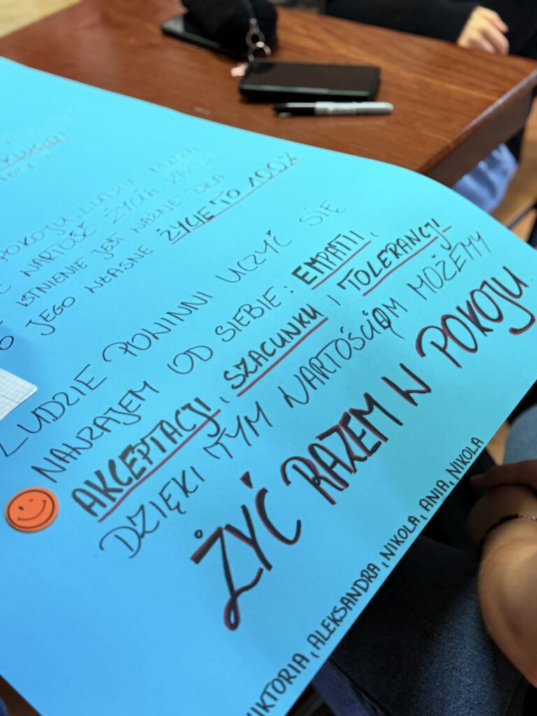 Ponad 50 uczniów aktywnie dzieliło się swoimi przemyśleniami: dążyć do kompromisu, dzielić się dobrem, mieć szacunek do innych, być wyrozumiałym, spotykać się i współpracować, nie ulegać presji społecznej, okazywać troskę w codziennych chwilach, uczyć się empatii, tolerancji i akceptacji – to wartości, które według nich pozwalają budować świat oparty na szacunku i pokojowym współistnieniu.