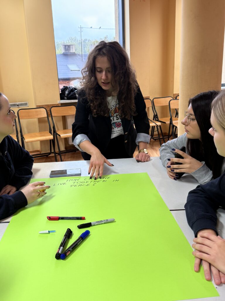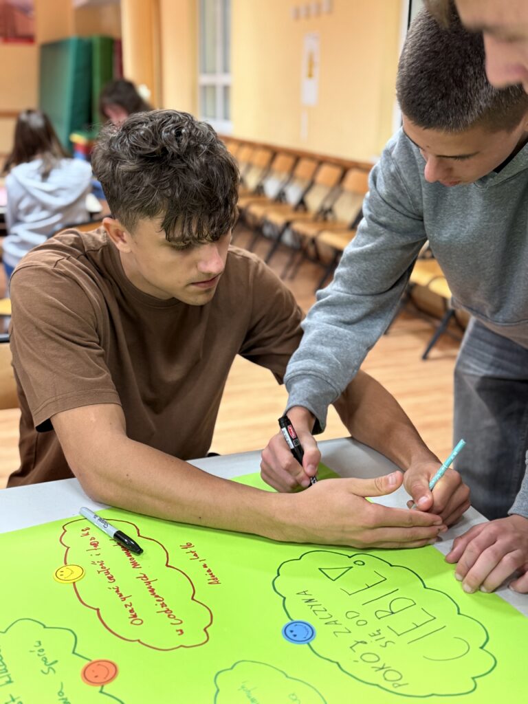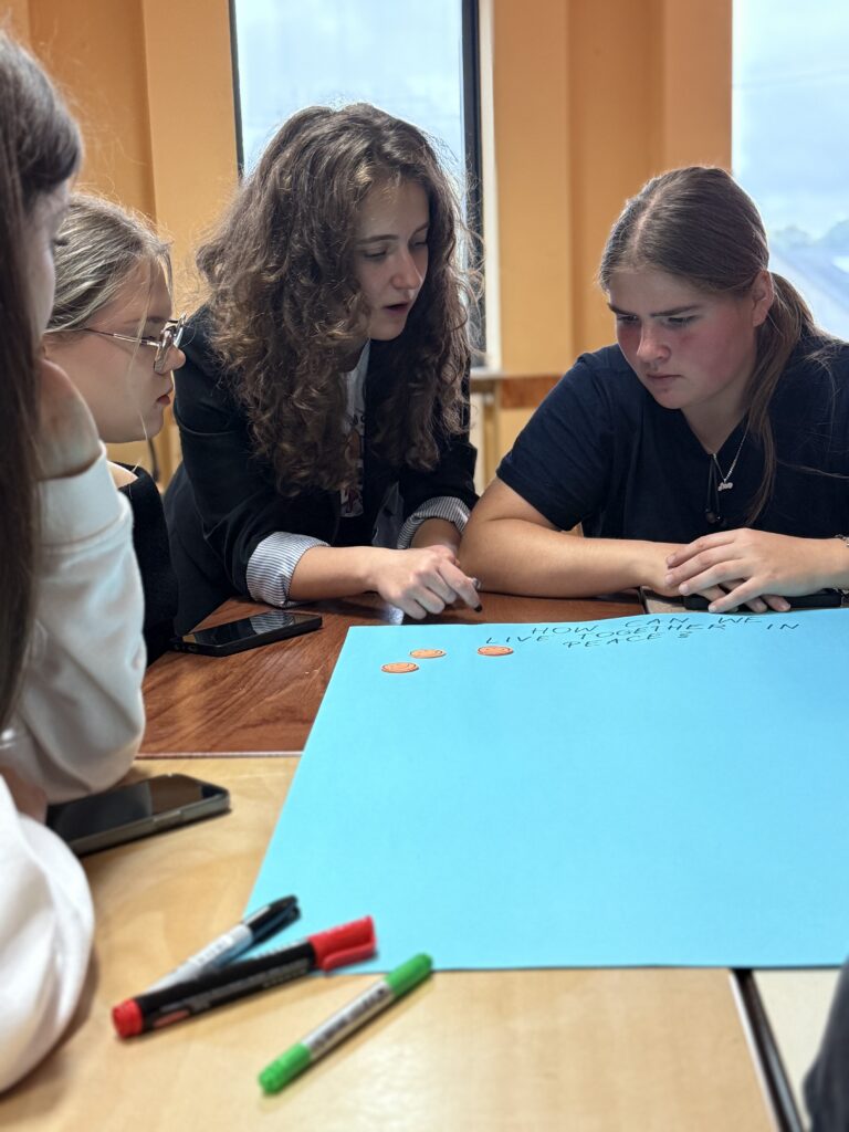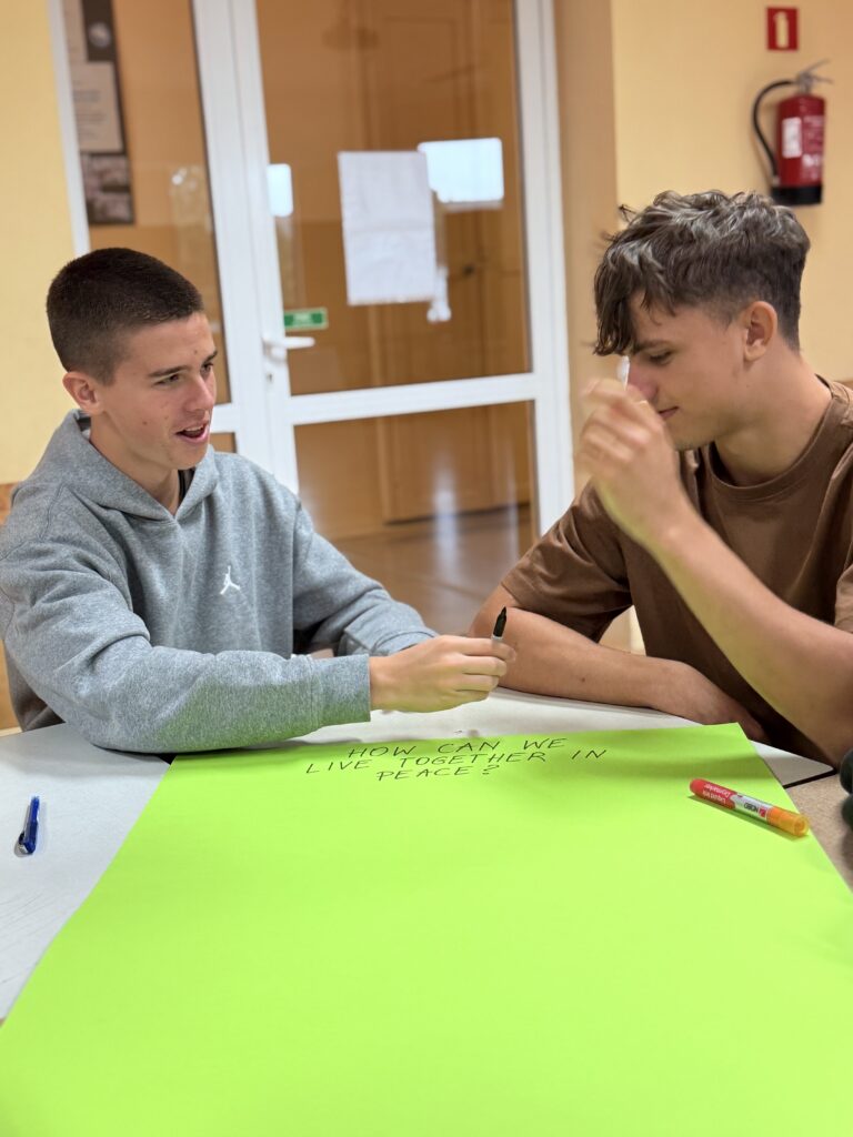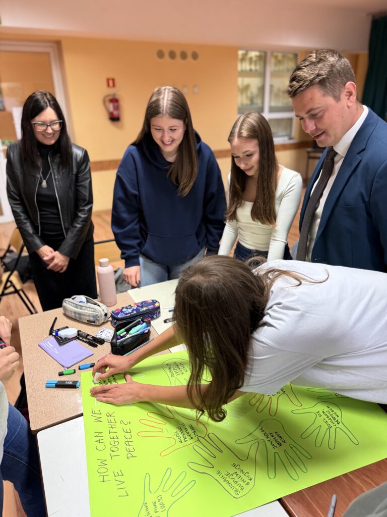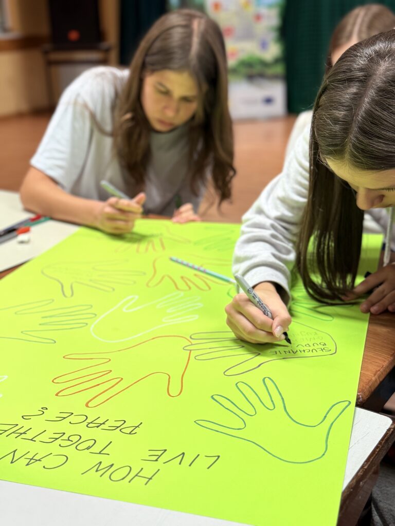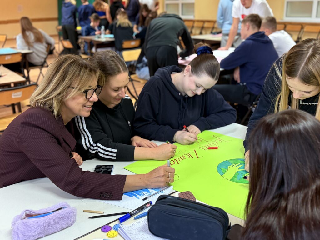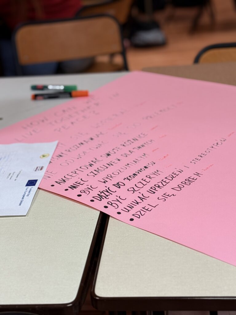 Ponad 50 uczniów aktywnie dzieliło się swoimi przemyśleniami: dążyć do kompromisu, dzielić się dobrem, mieć szacunek do innych, być wyrozumiałym, spotykać się i współpracować, nie ulegać presji społecznej, okazywać troskę w codziennych chwilach, uczyć się empatii, tolerancji i akceptacji – to wartości, które według nich pozwalają budować świat oparty na szacunku i pokojowym współistnieniu.