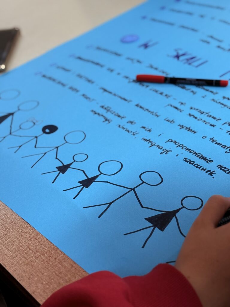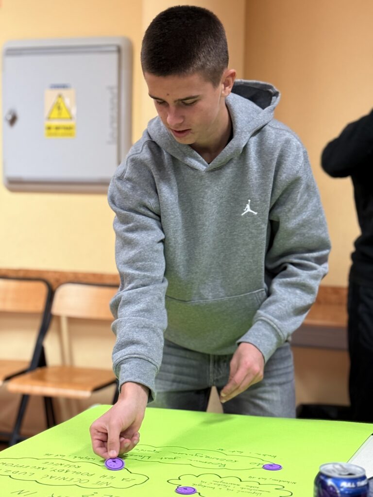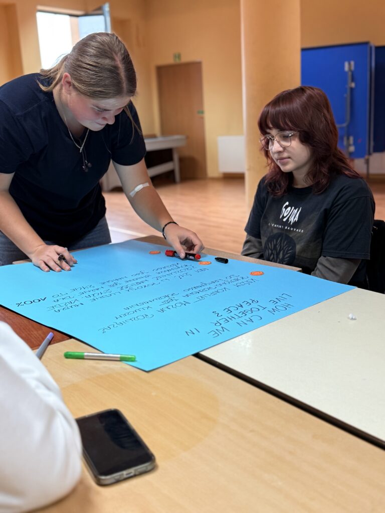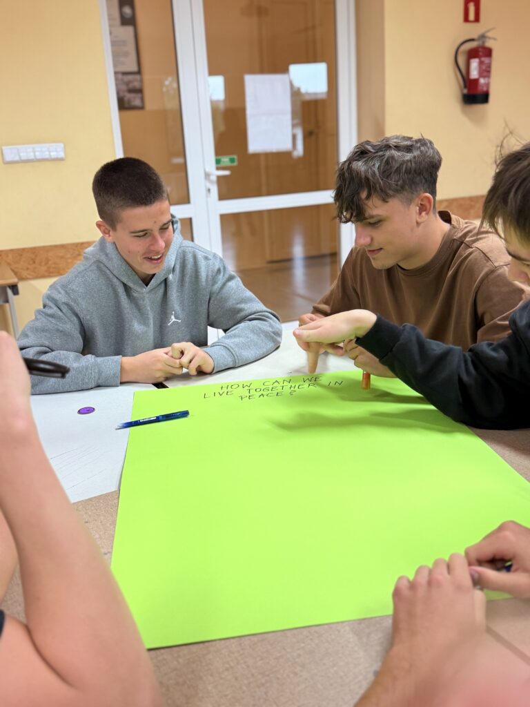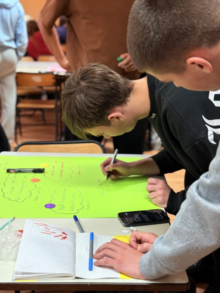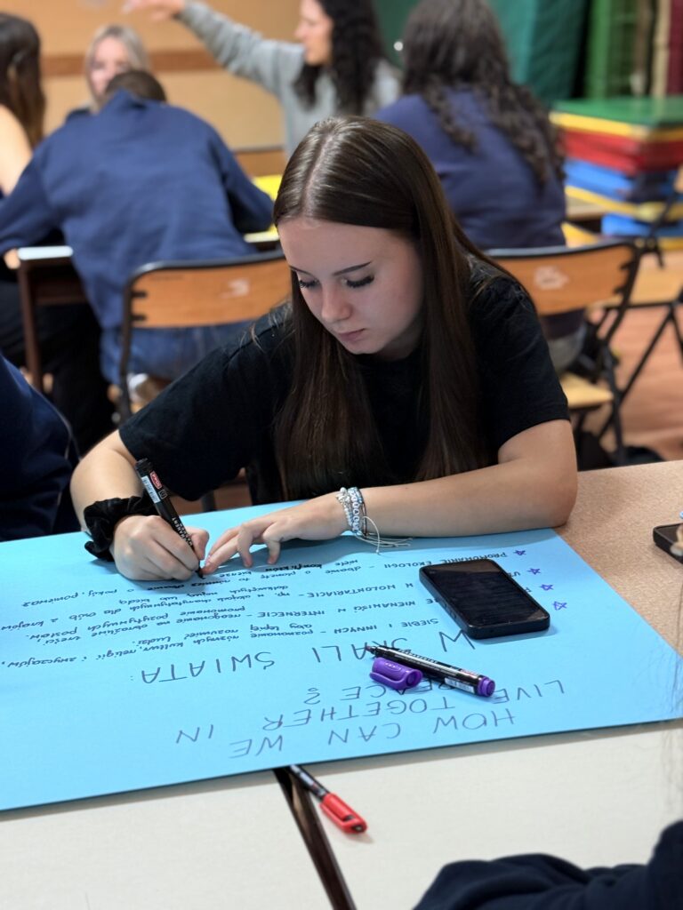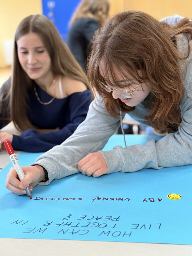 Ponad 50 uczniów aktywnie dzieliło się swoimi przemyśleniami: dążyć do kompromisu, dzielić się dobrem, mieć szacunek do innych, być wyrozumiałym, spotykać się i współpracować, nie ulegać presji społecznej, okazywać troskę w codziennych chwilach, uczyć się empatii, tolerancji i akceptacji – to wartości, które według nich pozwalają budować świat oparty na szacunku i pokojowym współistnieniu.