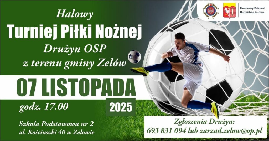 7 listopada 2025 r. strażacy z gminy Zelów zmierzą się w sportowych zmaganiach – tym razem nie przy wozach bojowych, lecz z piłką przy nodze. O godz. 17:00 w sali gimnastycznej Szkoły Podstawowej nr 2 w Zelowie (ul. Kościuszki 40) odbędzie się Halowy Turniej Piłki Nożnej Drużyn Ochotniczych Straży Pożarnych.