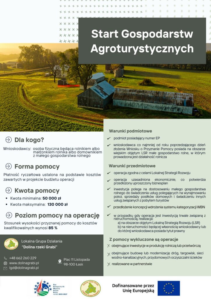 Lokalna Grupa Działania „Dolina Rzeki Grabi” ogłasza dwa nabory wniosków skierowane do mieszkańców, którzy planują założenie własnej działalności gospodarczej lub chcą rozwinąć swoje gospodarstwo poprzez uruchomienie agroturystyki. To realna szansa na pozyskanie znaczącego wsparcia finansowego i realizację własnych pomysłów biznesowych.