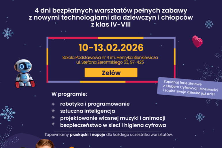 Klub Cyfrowych Możliwości zaprasza uczennice i uczniów klas IV–VIII na bezpłatne, czterodniowe warsztaty z nowych technologii. Podczas zajęć uczestnicy będą programować roboty, poznawać podstawy sztucznej inteligencji, tworzyć własne projekty muzyczne oraz zdobywać wiedzę z zakresu bezpiecznego i świadomego korzystania z Internetu. Warsztaty poprowadzą studentki kierunków ścisłych i technologicznych, które połączą praktyczną wiedzę z pasją do nowoczesnych rozwiązań. Zajęcia odbędą się w Szkole Podstawowej nr 4 przy ul. Żeromskiego 53 w Zelowie, w ...