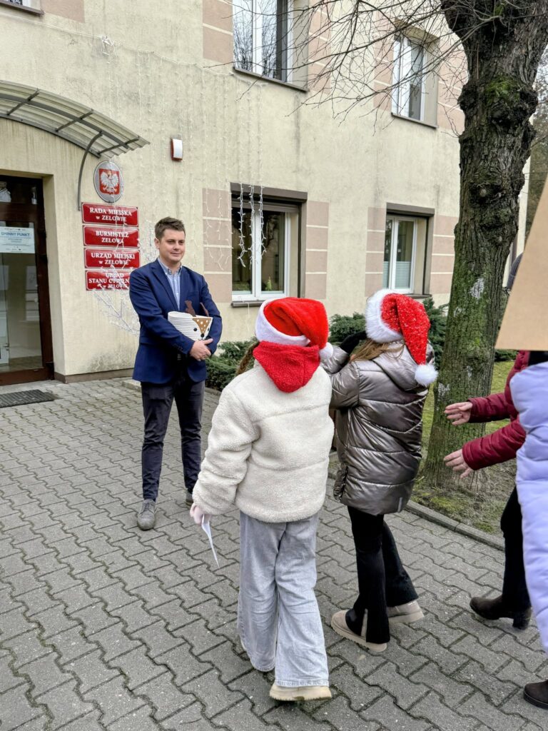 W trakcie pochodu mali Mikołaje odwiedzili także Urząd Miejski w Zelowie, gdzie spotkali się z Burmistrzem Zelowa Kamilem Świtałą. Burmistrz serdecznie przyjął uczniów, odpowiadał na ich pytania oraz podkreślił, jak istotne jest dzielenie się dobrem i wrażliwość na potrzeby innych.