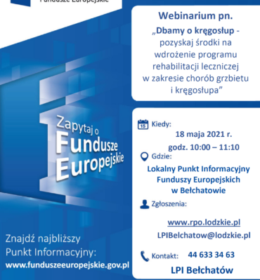 WięcejZapraszamy do udziału w bezpłatnym webinarium pn. „Dbamy o kręgosłup - pozyskaj środki na wdrożenie programu rehabilitacji leczniczej w zakresie chorób grzbietu i kręgosłupa”, którego ...